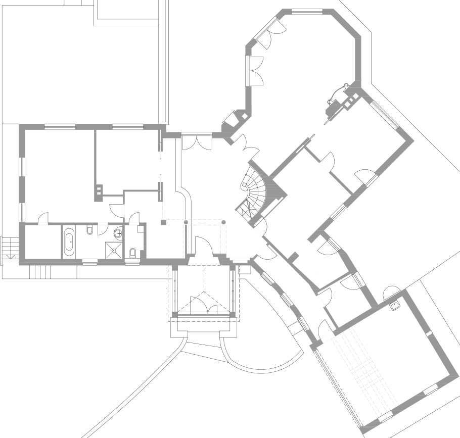 Парадный вход в дом, жилой блок и кабинет, верхняя видовая терраса с уличным камином, гараж, прачечная, зимняя столовая.