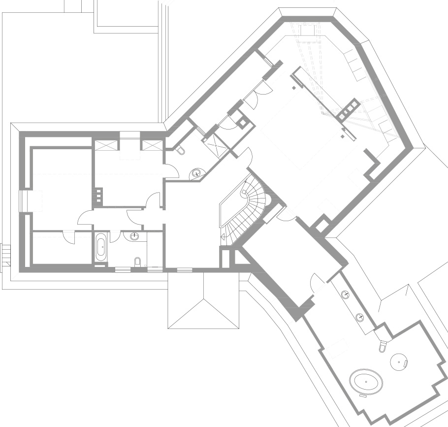 Холл первого этажа, хозяйский и детский блоки, спальни для мальчика и девочки c гардеробной и санузлом. Отдельная будуарная комната и главная ванная с джакузи.
